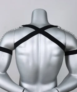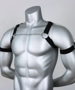 This lightweight shoulder harness combines stretchy black straps with shiny metal chains, delivering both style and a hint of dominance. It wraps around the chest and arms, highlighting your upper body and adding bold detail to your look.
