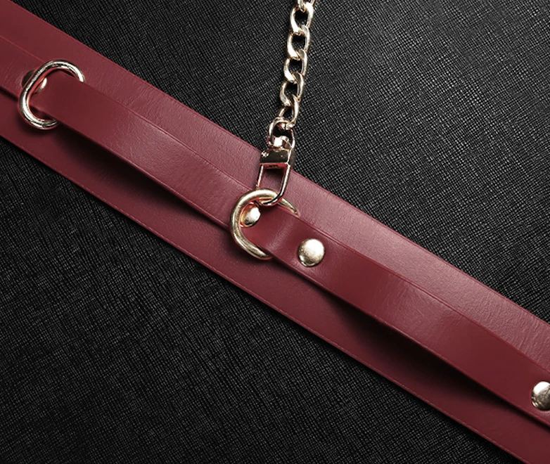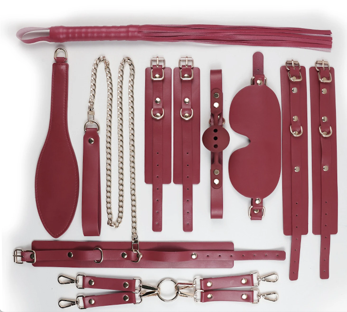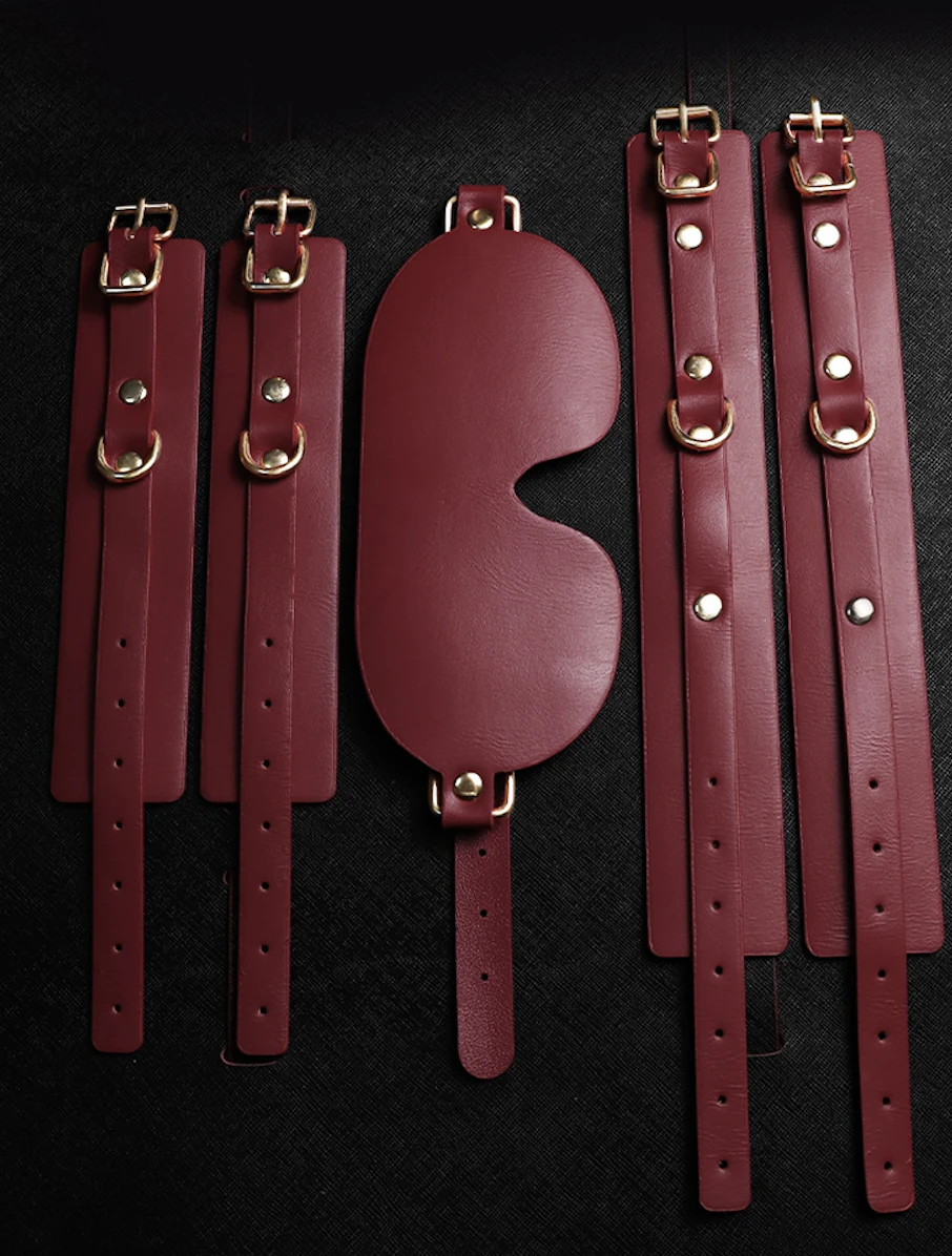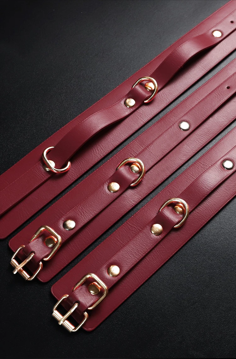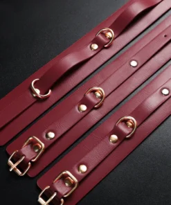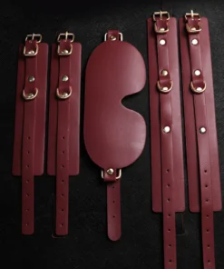 This elegant red bondage kit includes everything you need for stylish and secure restraint play. Crafted from smooth vegan leather with gold-tone hardware, each piece offers a perfect blend of comfort and control.