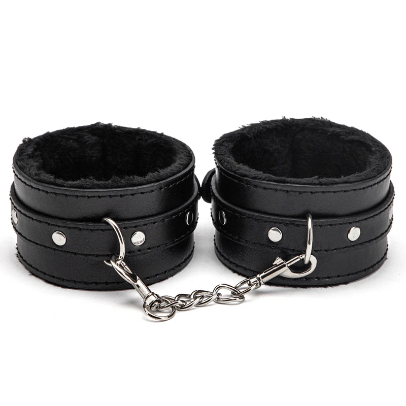 Soft black faux fur cuffs with adjustable straps and metal chain. Great for light restraint play.