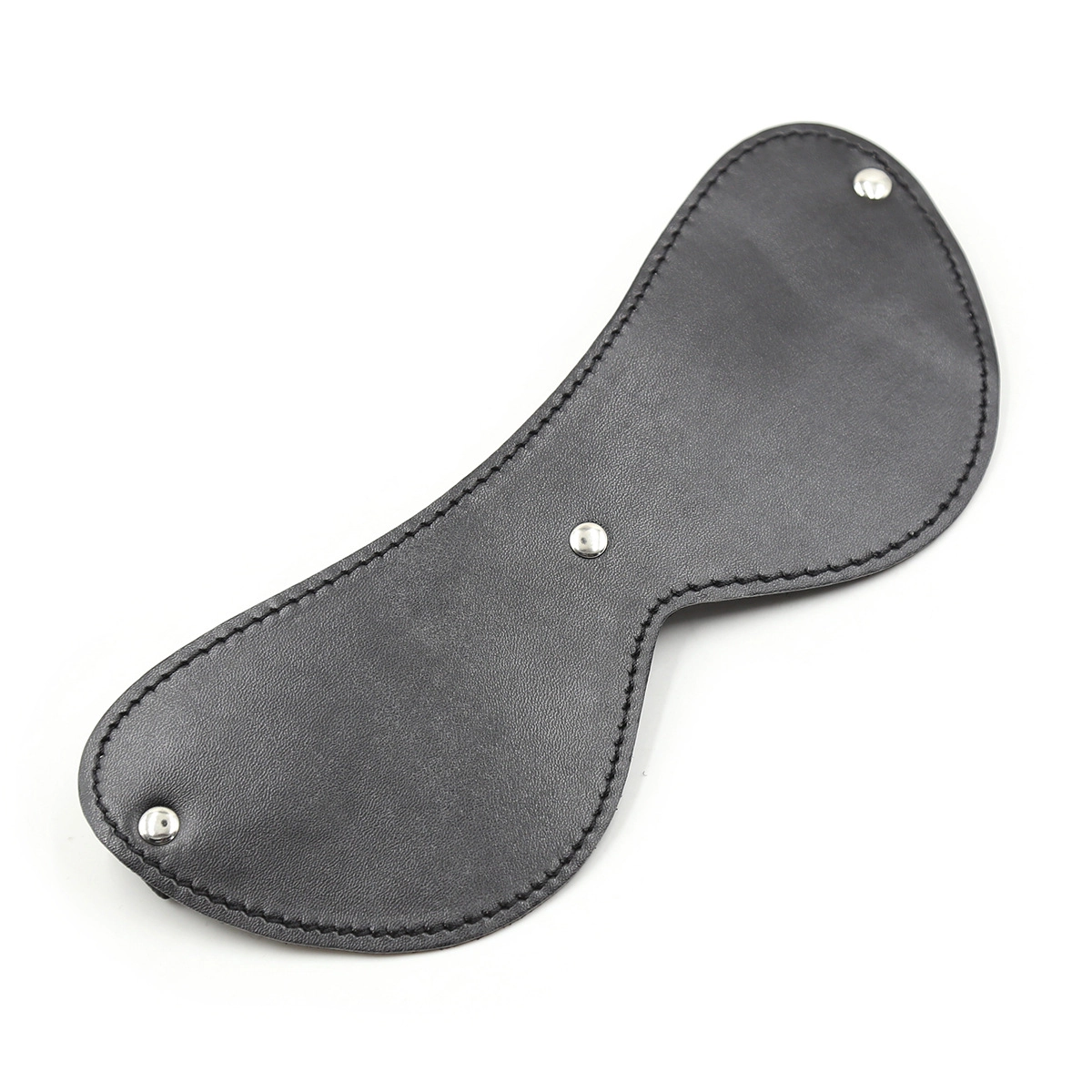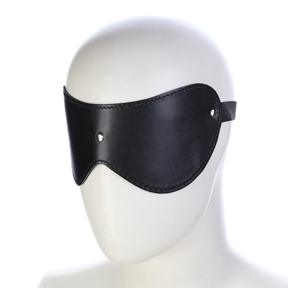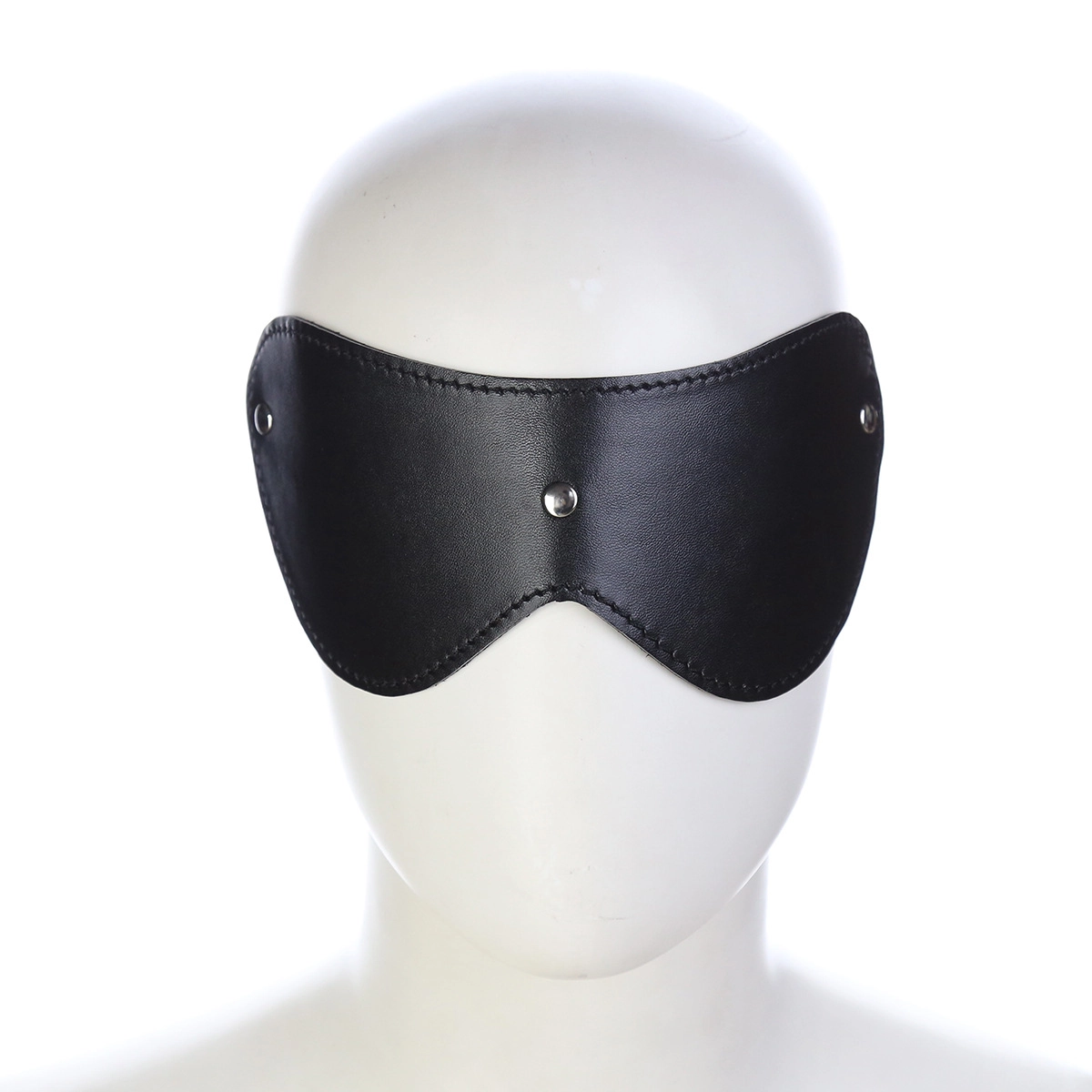This half-face blindfold is made of black leather with silver studs. It fully covers the eyes, blocking light, but keeps the mouth and nose free. Great for play that needs both mystery and talking.