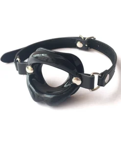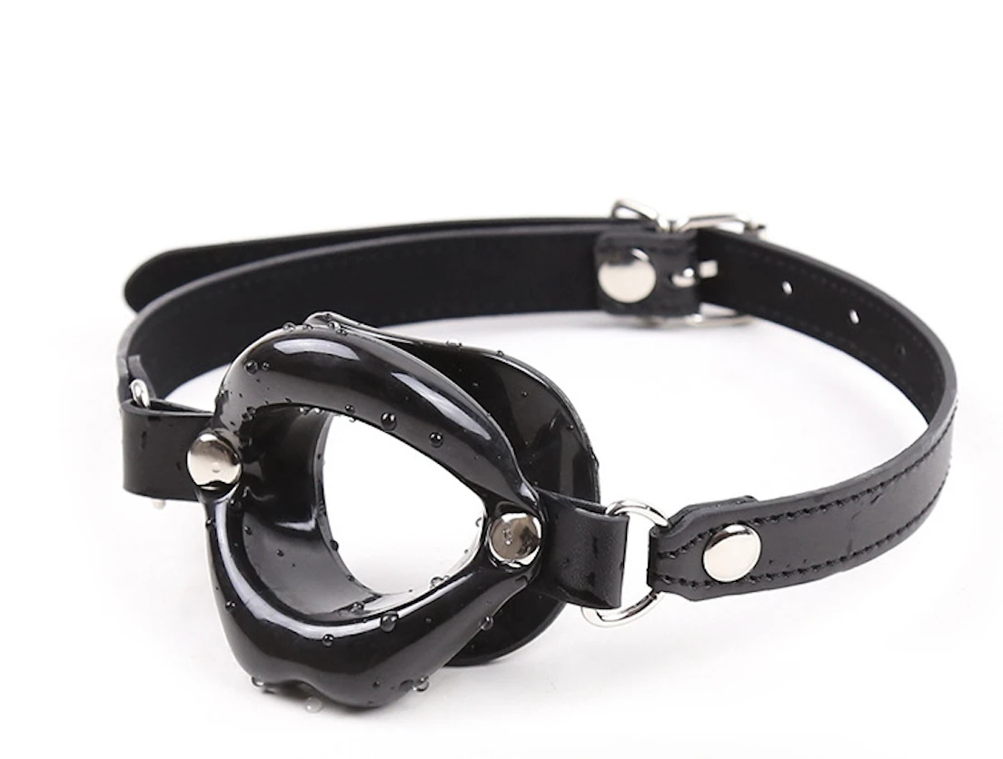 Shiny black open-mouth gag with adjustable strap. Made for breath play and oral access.