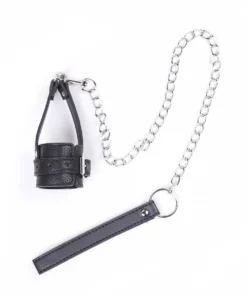 This chastity device is designed for playful control and power exchange. Made of durable PU leather and paired with a metal chain leash, it allows for secure restraint and stylish domination.