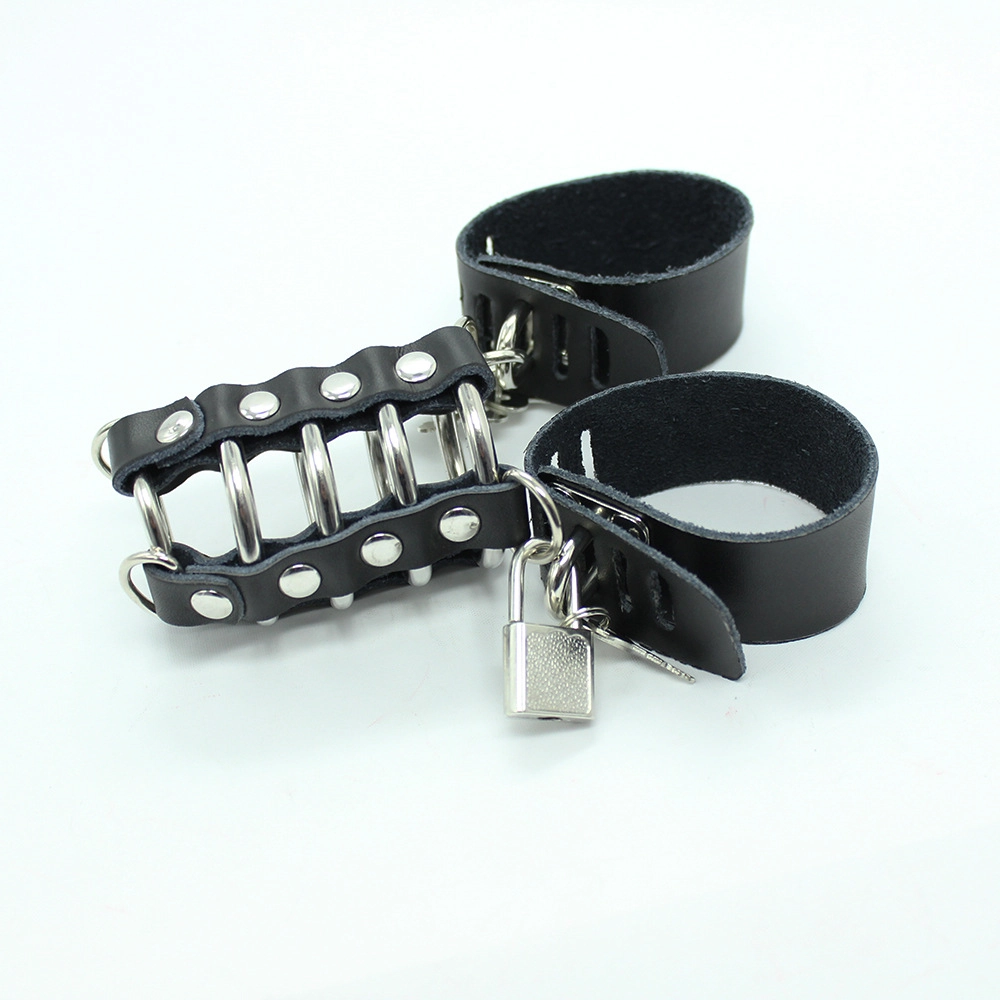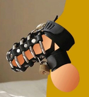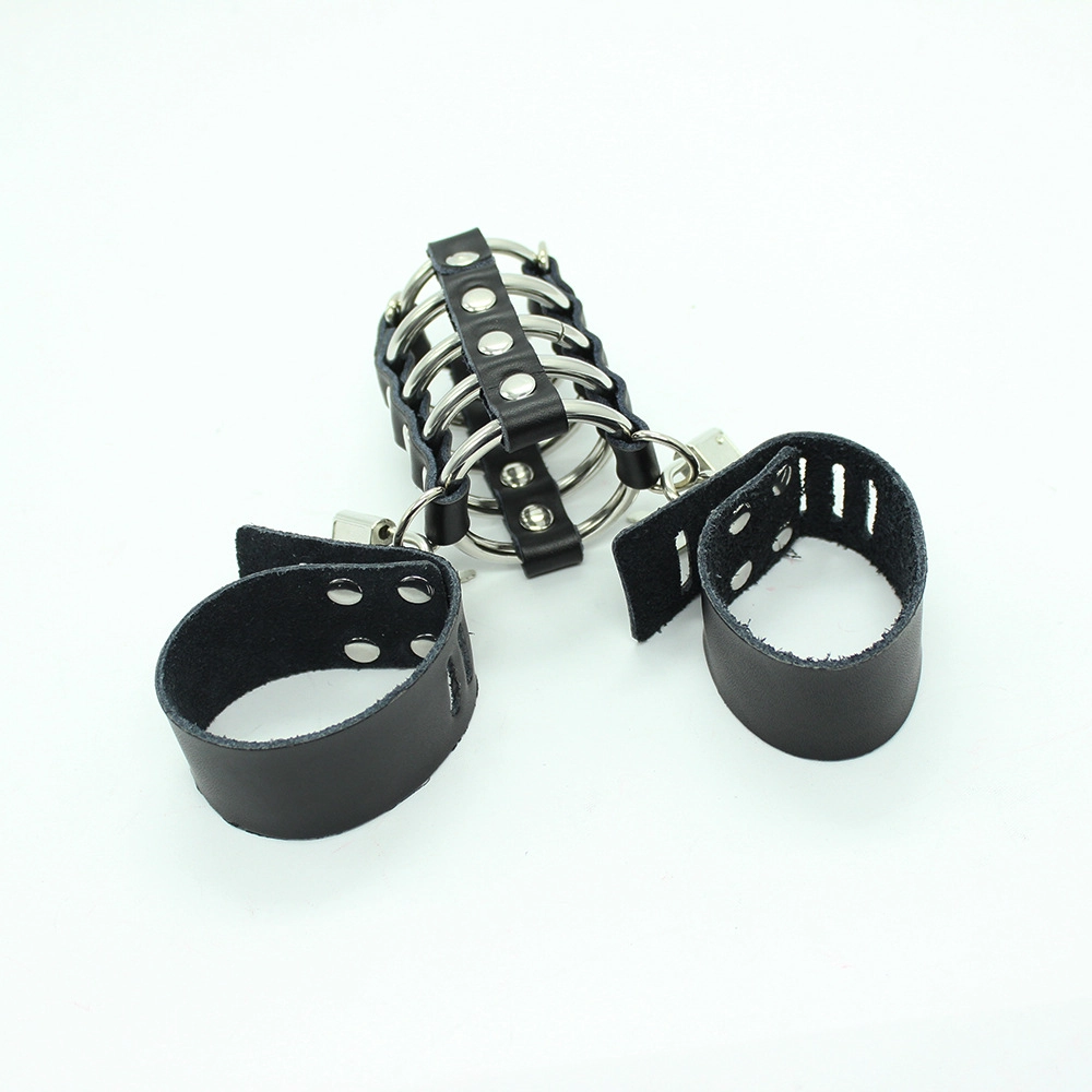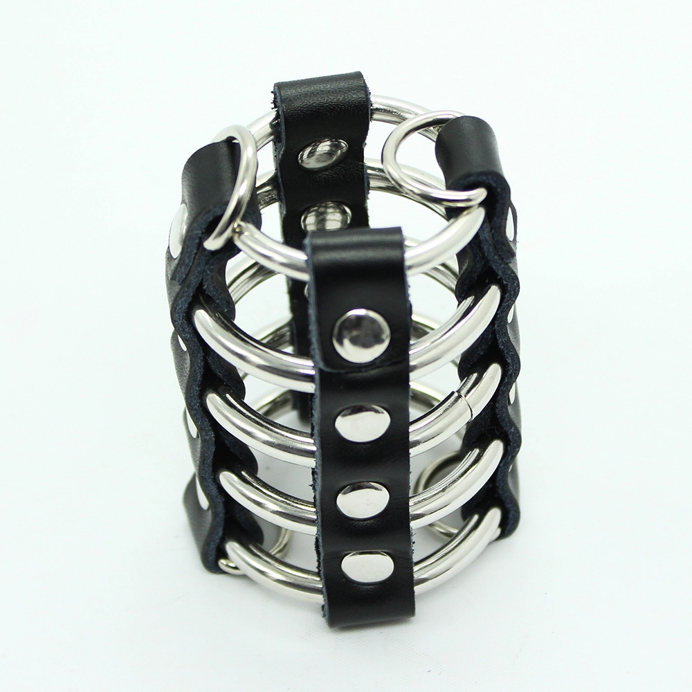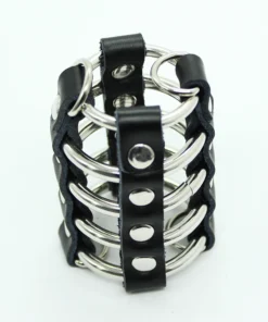 This chastity cage is made from a combination of tough leather and sturdy metal rings. The design restricts access and movement while offering a visual edge perfect for power exchange scenes.