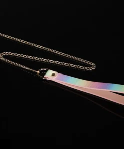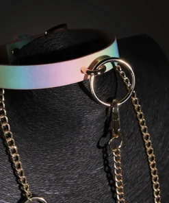 This collar and leash set is bright, soft, and fun. The collar has soft fake leather and a pretty rainbow look. It is easy to wear and fits most necks. The gold chain leash clips on fast and feels light.