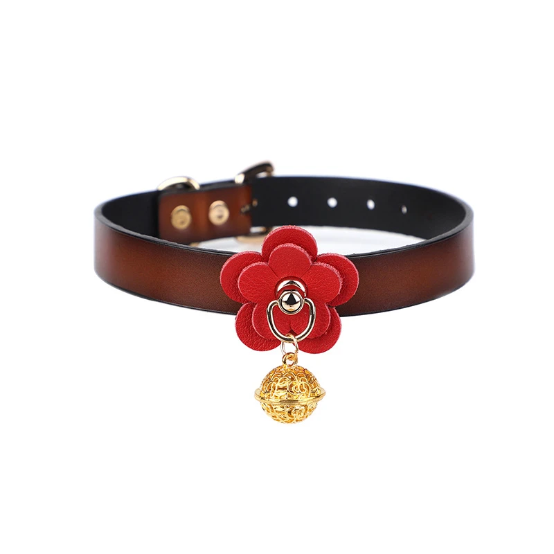Our Red Collar with Gold Bell and Flower features a vibrant red leather collar adorned with a beautiful flower and a delicate gold bell at the front. The bell’s soft chime adds a playful touch, while the flower design brings an elegant and whimsical feel. Crafted for comfort and style, this collar is perfect for those looking to combine beauty with a touch of kink.